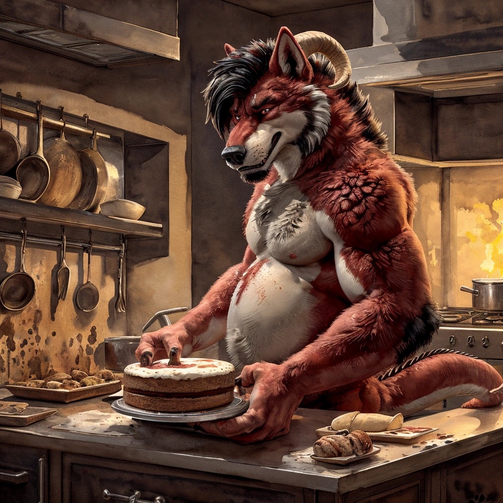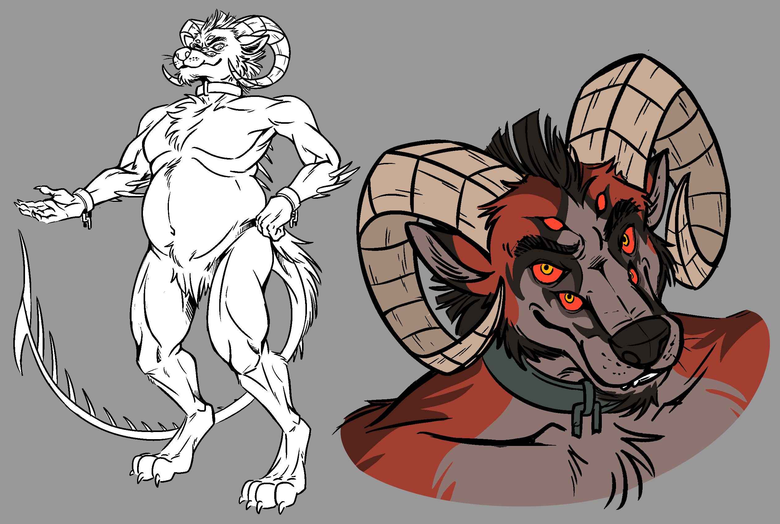 The sketch and face below is by Sprecht, who tends to do comedic and intense characters. The spines along back, and tail, are both pretty okay but the build could be more idealized *laughs* Love the face though. No spines on arms, that was from an earlier idea. Gamigin’s sigil also below. Some AI-generated slop purely to get some good images of body type strong but not hugely muscular, with some padding and the whole “never trust a skinny chef” thing, but these aren’t good images otherwise.