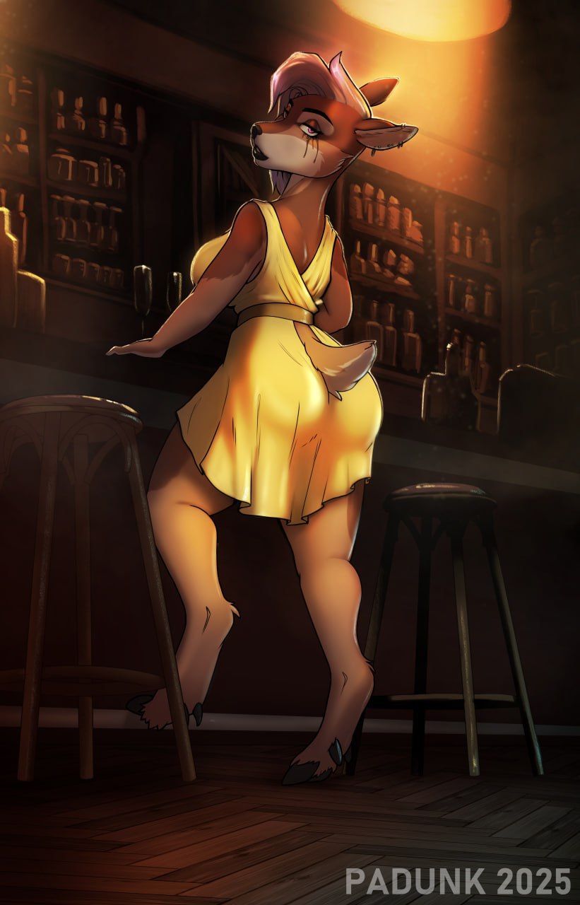 Colors – dark coat with spots that are not natural for a deer of her age. Dark pink eyes, sometimes with running mascara.
